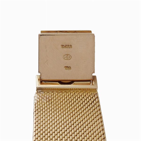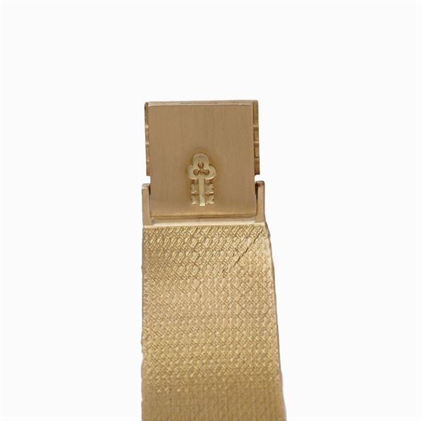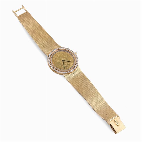 in oro giallo 18kt, cassa tonda 32 mm. ref. n. 318245, ghiera in oro e diamanti taglio brillante, quadrante moneta 10 dollari con diamanti taglio brillante per una caratura complessiva di ct 2 circa, movimento meccanico a carica manuale, ref. 159096, vetro zaffiro, bracciale originale in oro giallo 18kt maglia a tessuto con chiusura a cofanetto. peso 101 gr.
