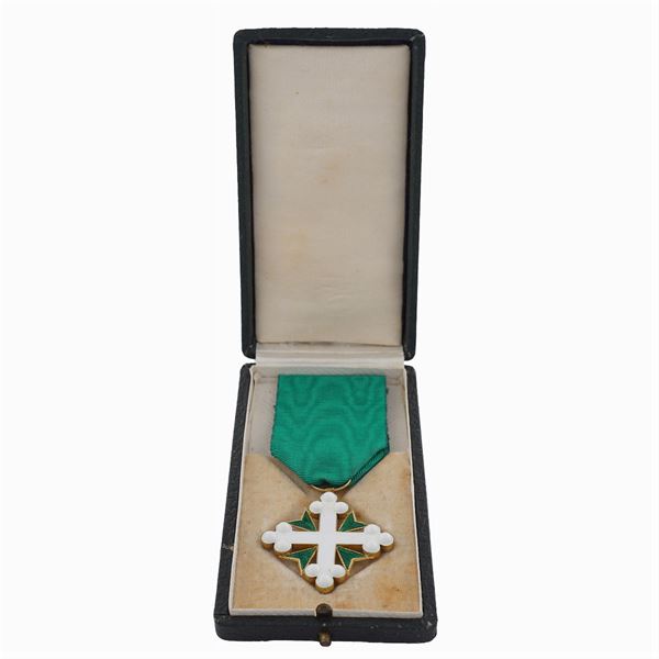 Maurizio e Lazzaro in argento dorato e smalti completa di nastrino verde, entro scatola originale, peso 10,5 gr.