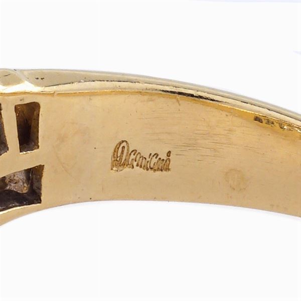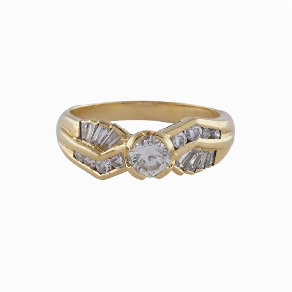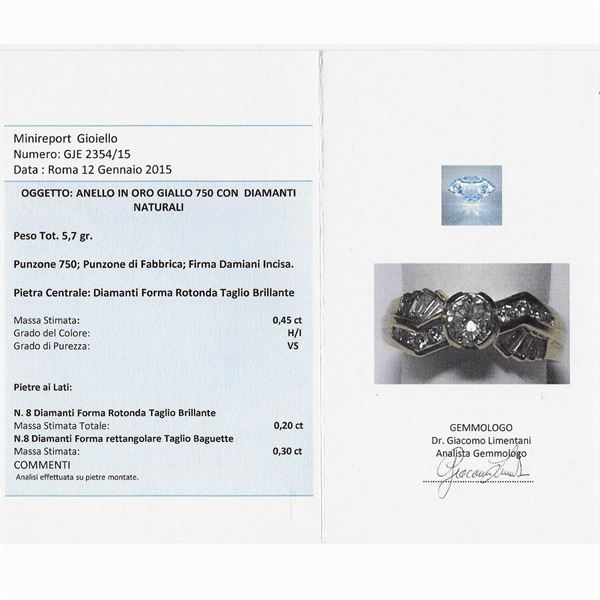 taglio brillante ct 0,45 circa colore H/I - purezza VS contornato da diamanti taglio brillante e baguettes ct 0,50 circa, firmato all'interno del gambo, misura 17. Completo di certificato gemmologico MGE n. GJE235415, peso 6 gr.