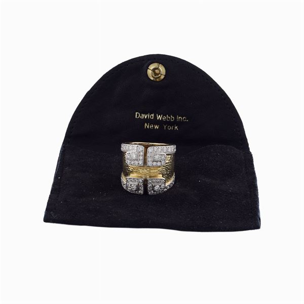 in oro giallo martelalto 18kt e platino con diamanti taglio brillante ct 2 circa disposti a motivo geometrico , firmato all'interno del gambo, misura 11. Completo di custodia originale , peso 28,5 gr.