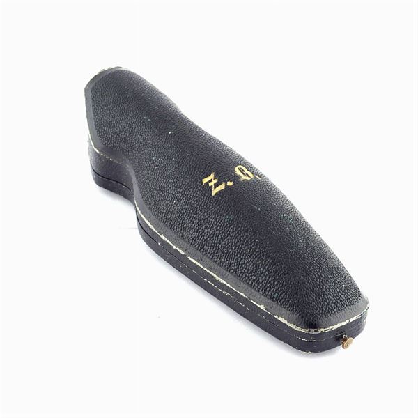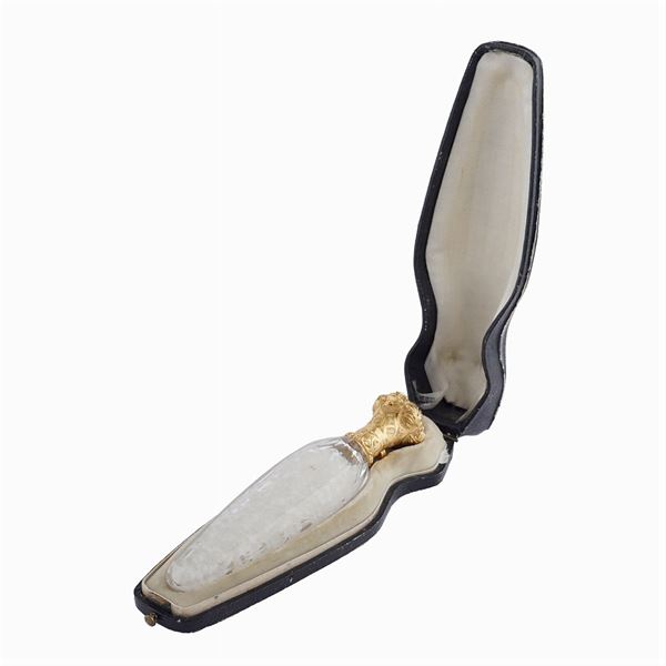 ampolla in cristallo sfaccettato, tappo e montatura in oro giallo 18kt inciso con motivi vegetali e di volute, entro custodia, h. 11,5 cm.