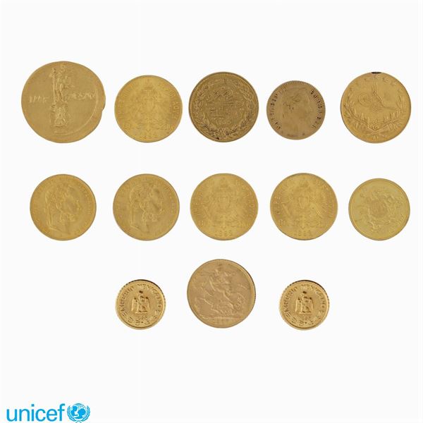 Gruppo di 13 monete in oro giallo 18kt - 22 kt