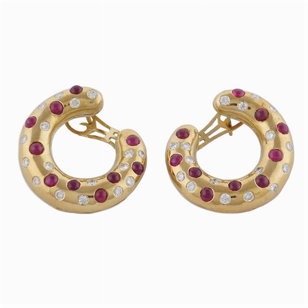 rubini taglio cabochon ct 1,20 circa alternati a diamanti taglio brillante ct 1 circa, peso 20,9 gr.