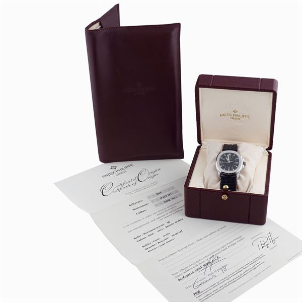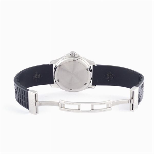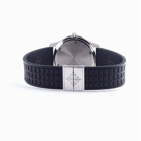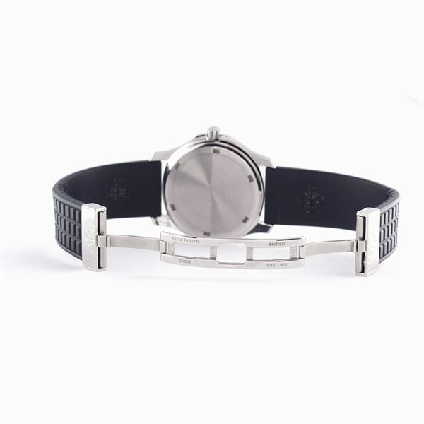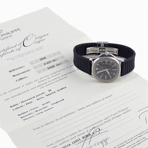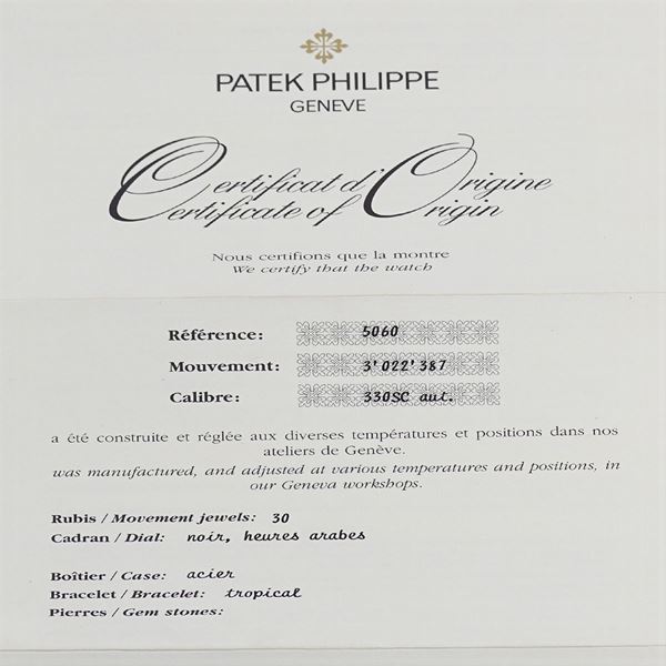 in acciaio, ref. n. 5060, cassa 36 mm., quadrante nero con numeri arabi e indici fluorescenti, datario ore 3, vetro zaffiro, movimento meccanico a carica autamatica ref. n. 3022387, calibro 330/194, cinturino originale in caucciu e acciaio con chiusura deployante in acciaio. Completo di scatola e garanzia