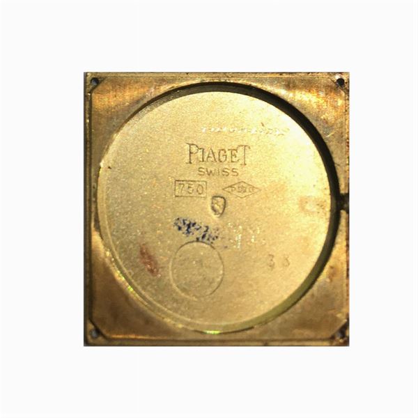 in oro giallo 18kt cassa quadrata 25x25 mm., quadrante nero con indici dorati, lievi difetti, ref. n. 935 C 4 - 344751, vetro zaffiro, movimento meccanico a carica manuale, bracciale originale in oro giallo 18kt, maglia a tessuto, chiusura con stemma araldico inciso e catenina di sicurezza.