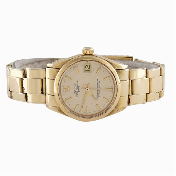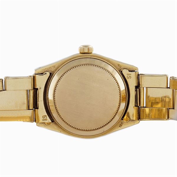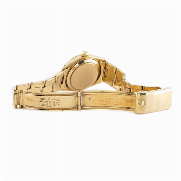 orologio da polso in oro giallo 18kt, ref. n. 6627, cassa tonda 30 mm. ref. n. 2592896 -6624 , quadrante dorato con indici dorati, datario ore 3, movimento meccanico a carica automatica, calibro RX 1161, bracciale oyster originale in oro giallo, completo di scatola, garanzia e una maglia supplementare. peso 79,5 gr.