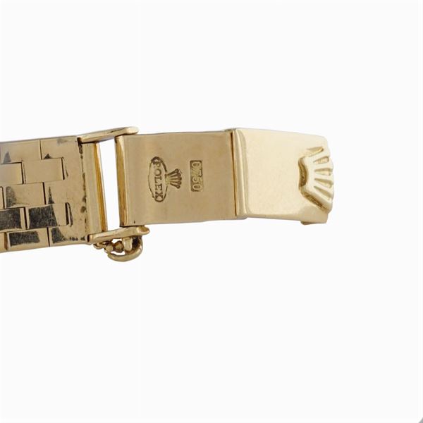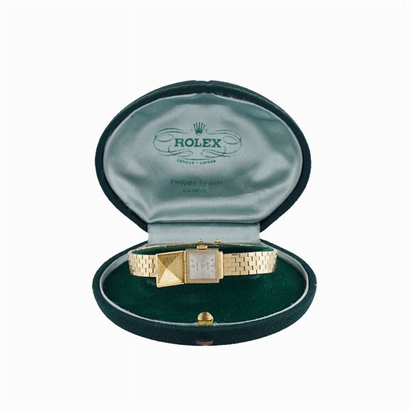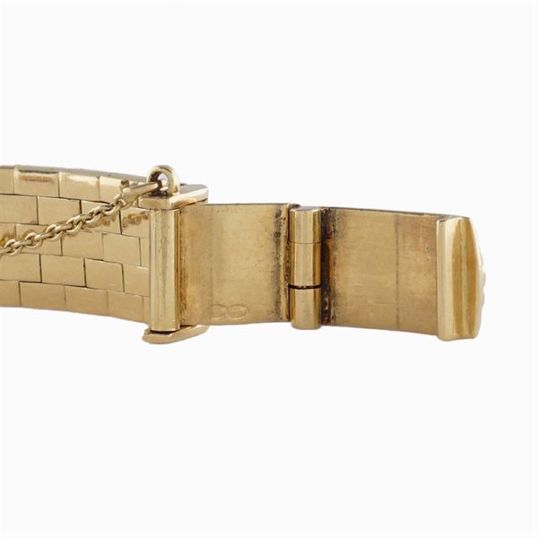 in oro giallo 18kt, cassa carré a scomparsa 14 mm. , ref. n. 19489, quadrante argentato con indici dorati, movimento meccanico a carica manuale, bracciale originale in oro giallo 18kt maglia a carrarmato con chiusura a cofanetto. Completo di scatola originale, peso 35,3 gr.