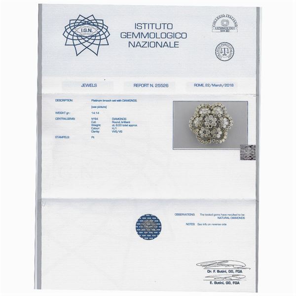 taglio brillante ct 8 circa colore H/I - purezza VVS/VS. Completa di certificato gemmologico I.G.N. n. 25526, peso 14 gr.
