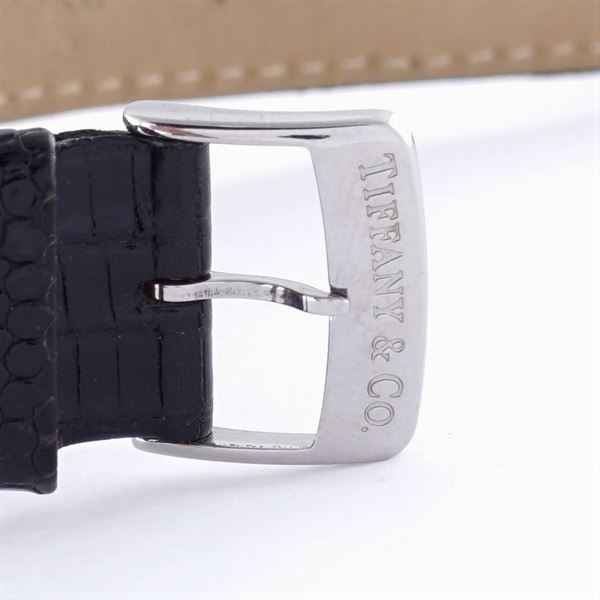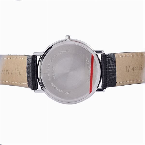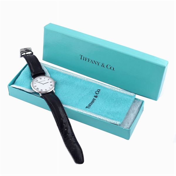 in acciaio argentato, cassa tonda 36 mm., ref. n. 070111422, quadrante bianco con numeri romani, movimento al quarzo, cinturino con fibbia originale in pelle e acciaio. Completo di scatola originale