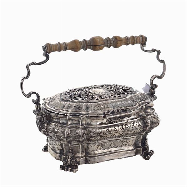corpo sagomato, cesellato ed inciso con motivi vegetali, poggiante su quattro piedini a riccio, coperchio traforato con motivi di volute e centrato da un cartiglio, manico a doppia voluta contrapposta con la parte centrale in legno tornito, 18x23x13,5 cm.