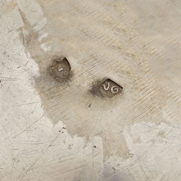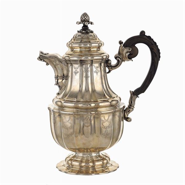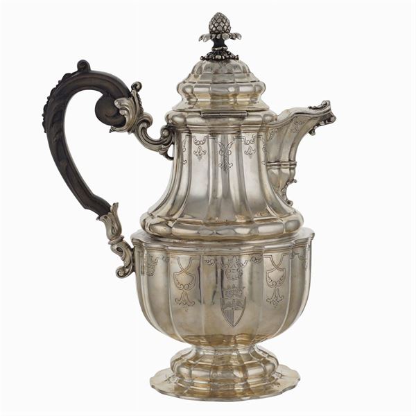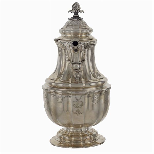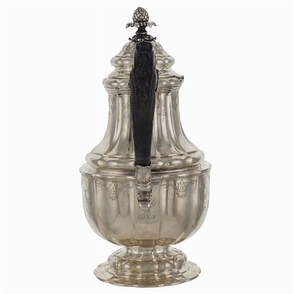 corpo sfaccettato cesellato con motivi vegetali, manico a voluta in legno ebanizzato, presa del coperchio a foggia di pigna, h. 30 cm., peso 1094 gr.