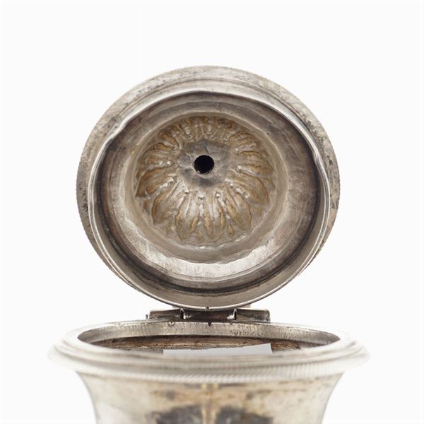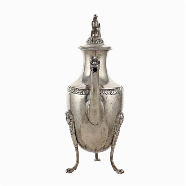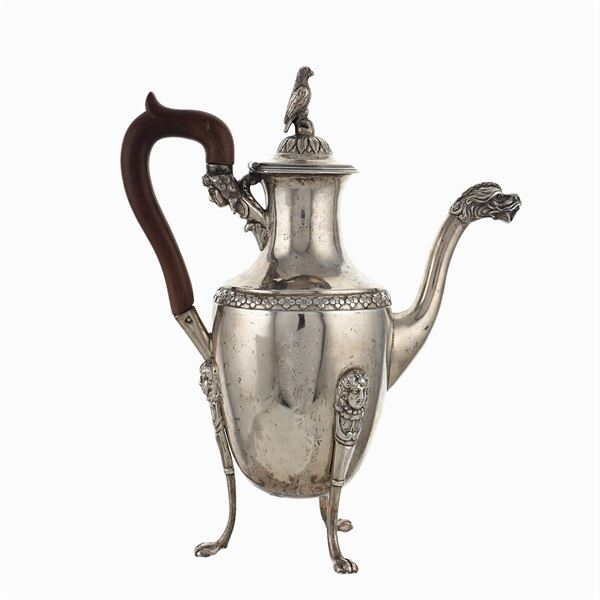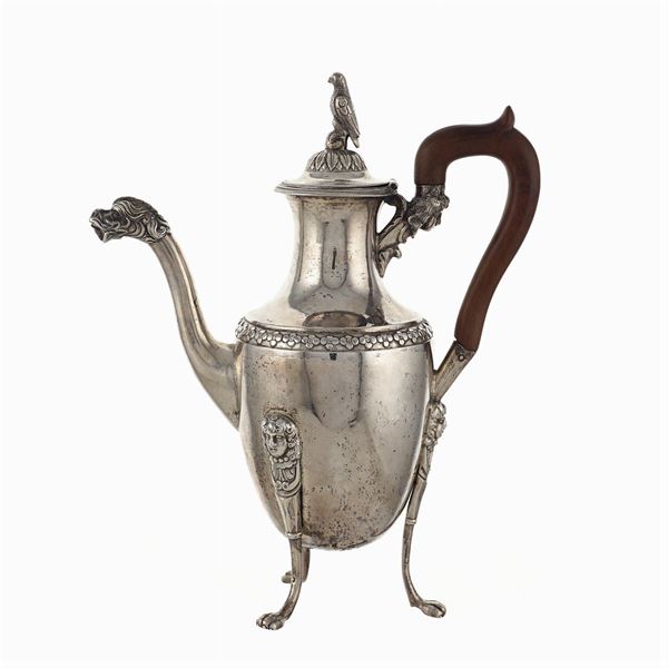 corpo piriforme cesellato con motivi floreali e volti femminili, becco con terminale raffigurante una testa di animale mitologico, presa del coperchio a foggia di volatile, manico in legno sagomato, h. 26,5 cm., peso 624 gr.