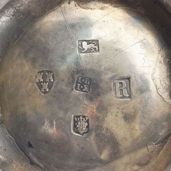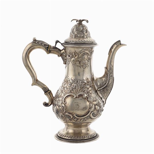 orafi John Langlands & John Robertson I, corpo cesellato con motivi floreali e vegetali, manico a voluta con inserti in avorio, h. 28 cm., presa del coperchio mancante, lievi difetti, peso 906 gr.