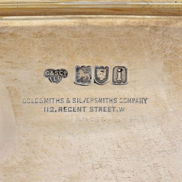 orafo Goldsmiths & Silversmiths, corpo liscio con profilo baccellato, ampolla interna mancante, 7x22x19,5 cm , peso 598 gr.