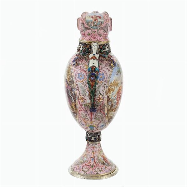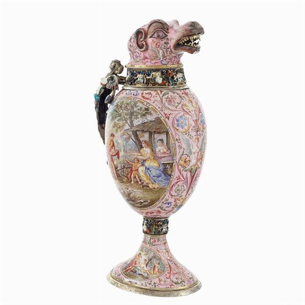 superficie rosa decorata con motivi vegetali, grottesche e quattro scene mitologiche entro riserve, coperchio a foggia di testa di animale mitologico, manico a cariatide alata, lievi difetti, h. 31 cm., peso 532 gr.