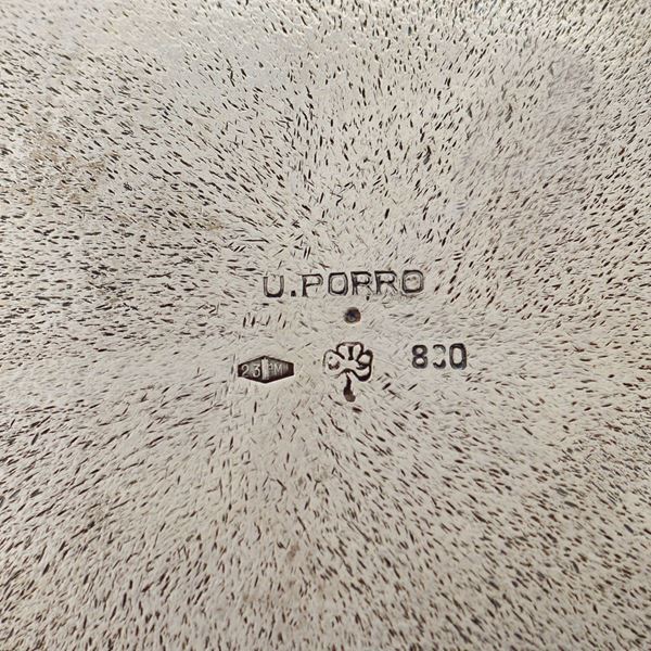 orafo Luigi Genazzi - Milano, corpo bombato ed inciso a due manici sagomati con attacco naturalistico, presa del coperchio e piedini cesellati a foggia di frutti, 31x44,5 cm.