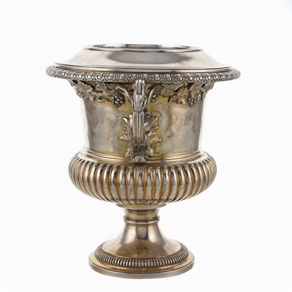 orafi Fentem,Webster & Danby, corpi circolari lisci e baccellati, decorati con tralci di vite, manici a volute vegetali, 26x30x23 cm., peso 5980 gr.