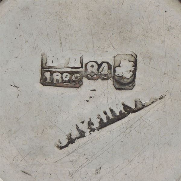 composto da quattro bicchieri da vodka, h. 5 cm. e un portacipria, d. 6,5 cm., difetti, peso 135 gr.