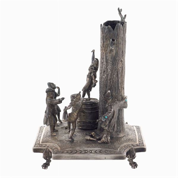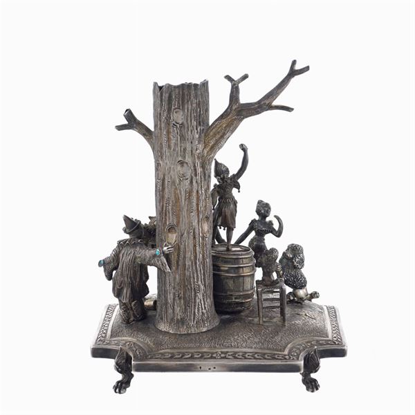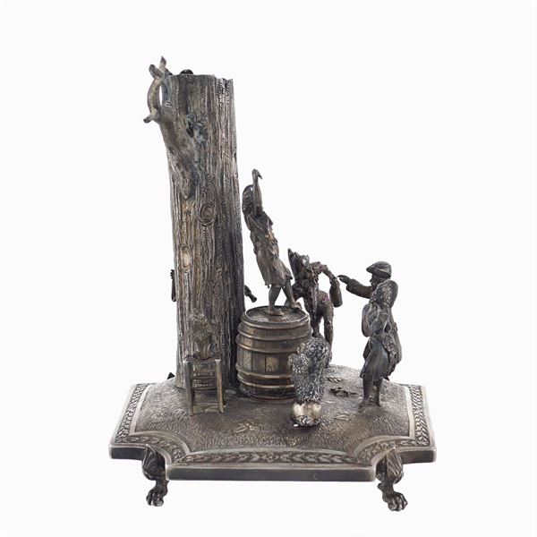 cesellato ed inciso a raffigurare personaggi con animali, base quadrata con angoli smussati profilata con motivi vegetali e poggiante su quattro piedini ferini, 17x12x12 cm., peso 546 gr.