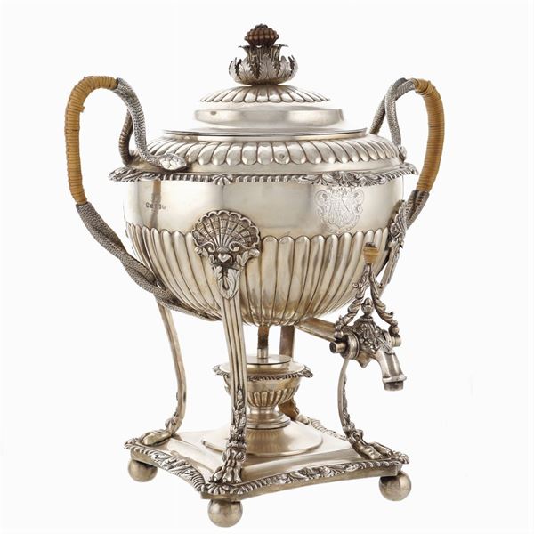 orafi Rebecca Emes & Edward Barnard, corpo baccellato e cesellato con motivi vegetali, manici a foggia di serpenti intrecciati parzialmente rivestiti in midollino, piedini di forma sferica, 40x30x37 cm., peso 4543 gr.