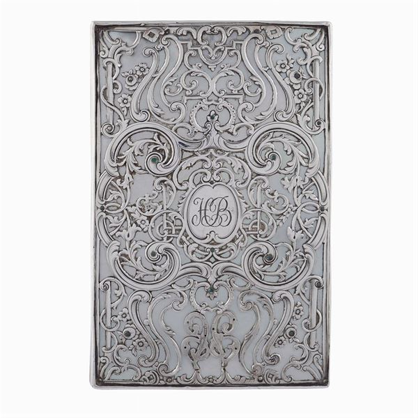 orafo Berthold Muller, forma rettangolare, coperchio decorato con motivi di volute e monogramma entro cartiglio al centro, fascia con motivi floreali, usure, 2,5x10,5x6,5 cm., peso 182 gr.