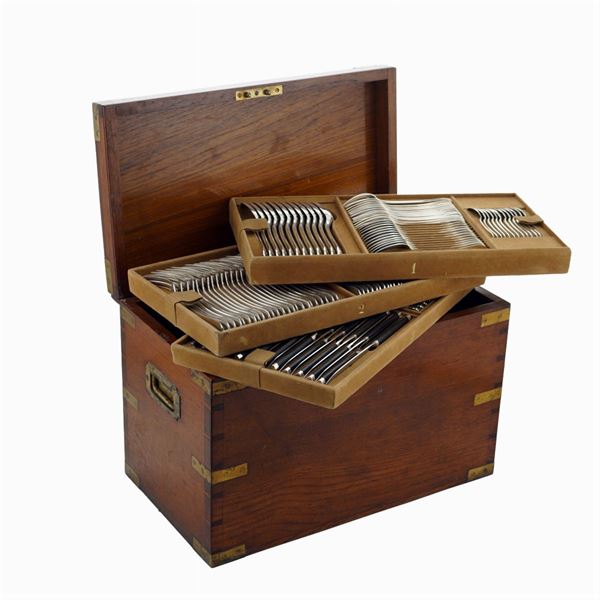 composto da 24 forchette,12 cucchiai, 24 coltelli con manico in ebano, 12 forchette da pesce, 12 coltelli da pesce, 12 forchette da frutta, 24 coltelli da frutta con manico in osso (non pertinenti), 12 cucchiai da dessert e 12 cucchiaini da caffè, entro scatola in rovere e metallo, peso 6345 gr.