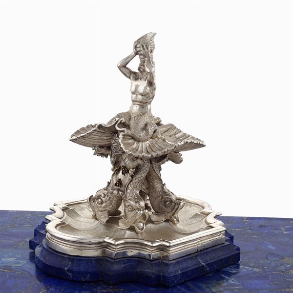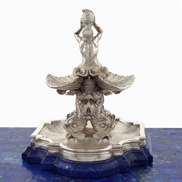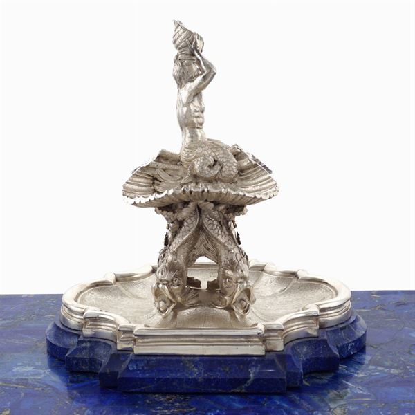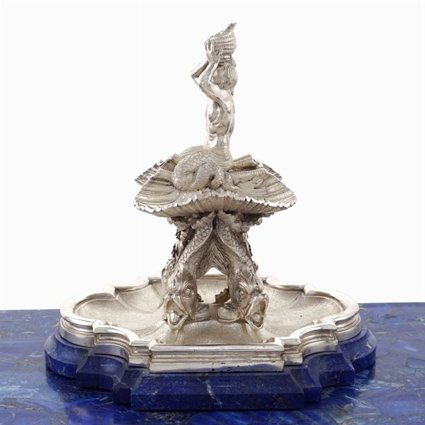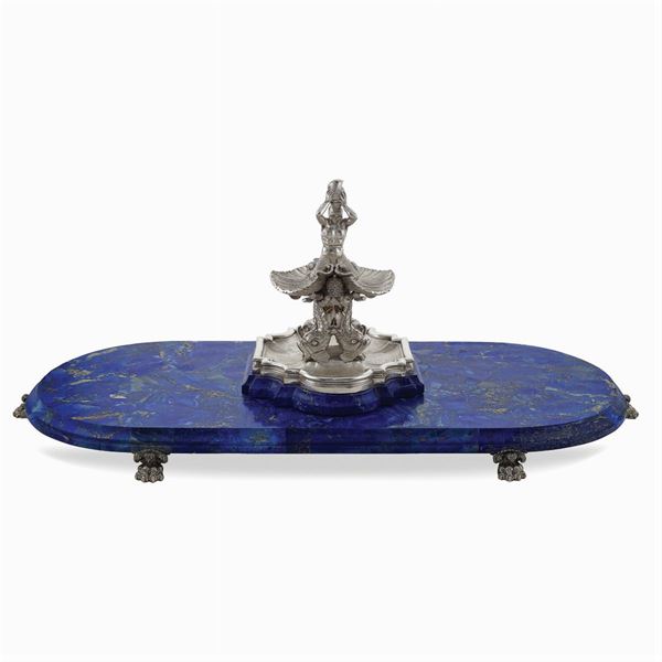 composto da un elemento di forma ovale in lapislazzulo poggiante su sei piedini ferini in argento e sormontato da un centrotavola in argento raffigurante la fontana del Tritone di piazza Barberini su base sagomata in lapislazzulo.
