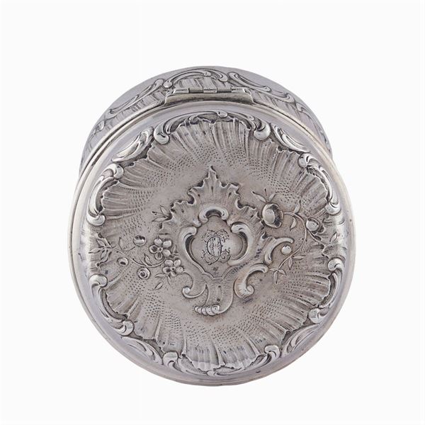 forma circolare, coperchio e fascia decorati con motivi di volute, monogramma centrale entro cartiglio, 3,5x7 cm., peso 180 gr.