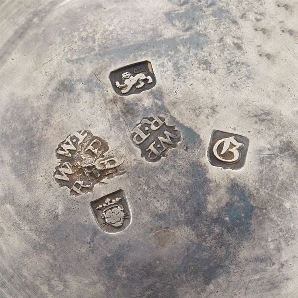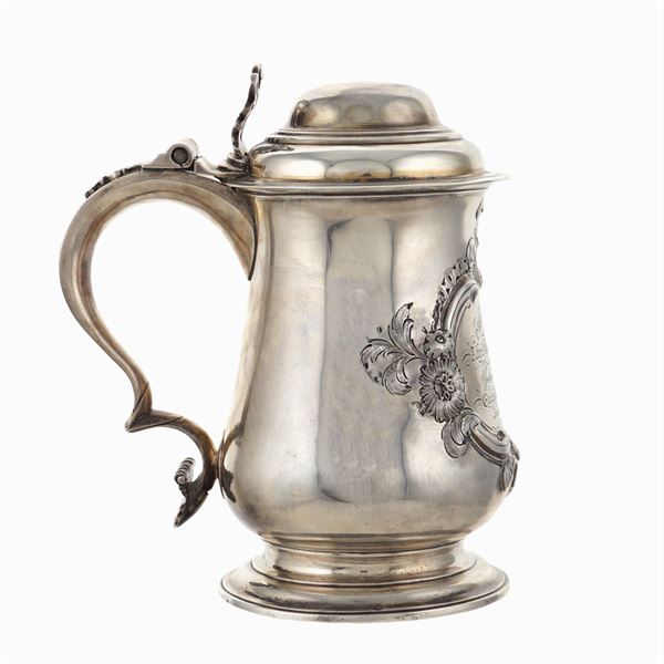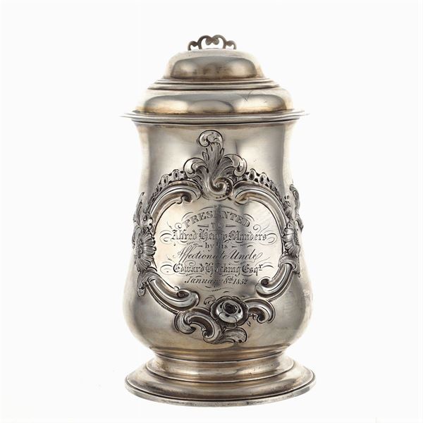 orafi argentieri William e Robert Peaston, base circolare a corpo liscio centrato da un cartiglio, interno in argento  vermeil, manico sagomato, h. 21 cm., peso 842 gr.