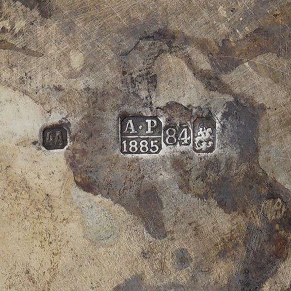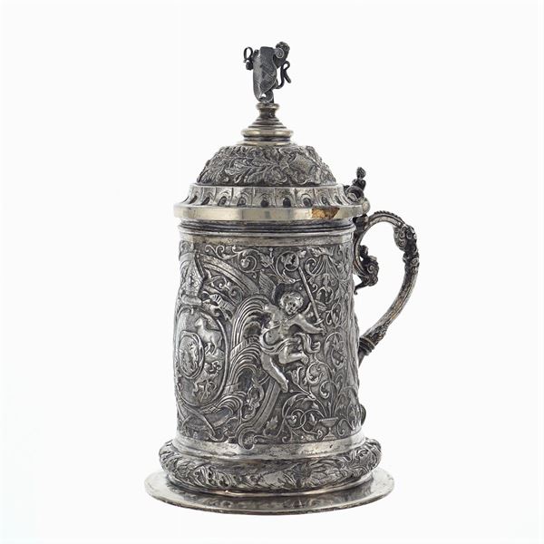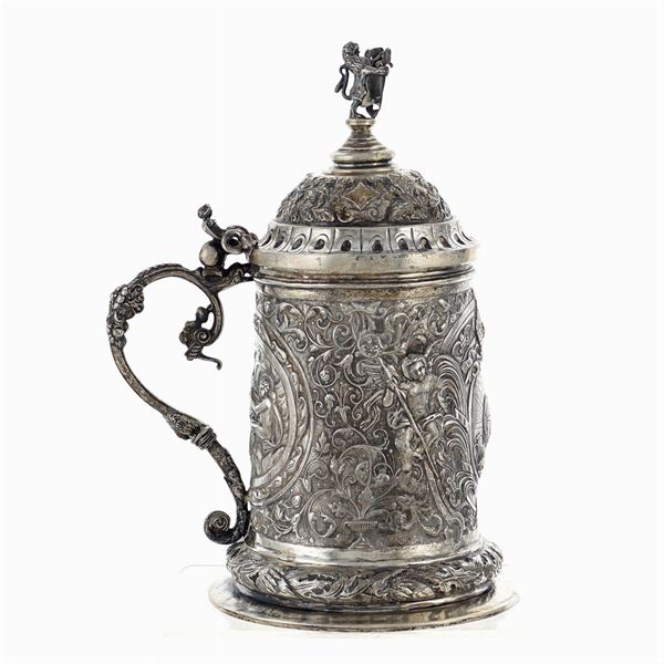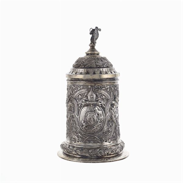 orafo Andreì Andreev Aleksandrov, saggiatore A.Romanov, corpo riccamente cesellato con motivi vegetali e scene di personaggi, uno stemma araldico entro riserva, presa a voluta, coperchio sormontato da un leone rampante con scudo,