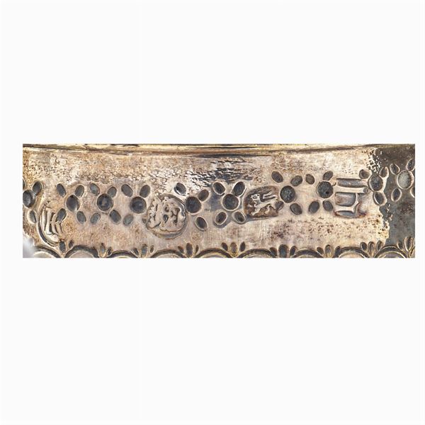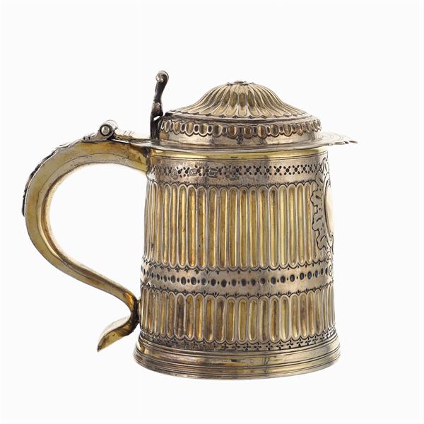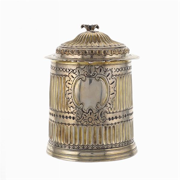 corpo baccellato ed inciso, manico sagomato, presa del coperchio a ricciolo, h. 17 cm. , peso 764 gr.