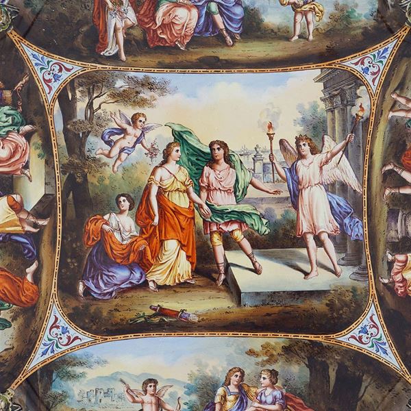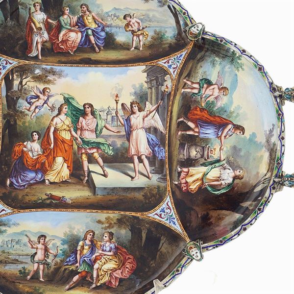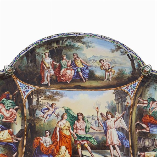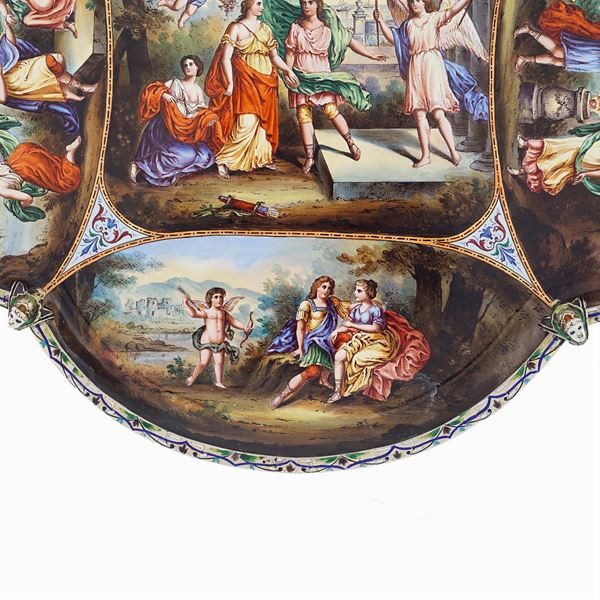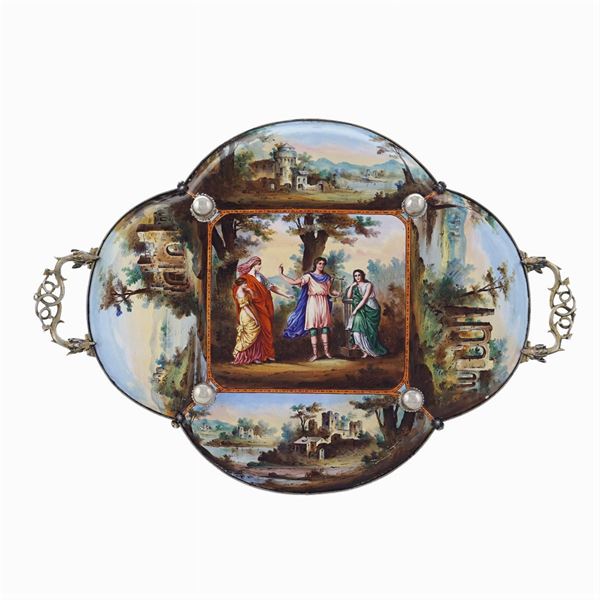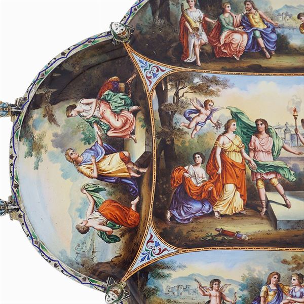 forma sagomata, superficie interamente dipinta con cinque scene mitologiche entro riserve, manici a foggia di serpente mitologico, poggiante su quattro piedini sferici, 39x28 cm., peso 1070 gr.