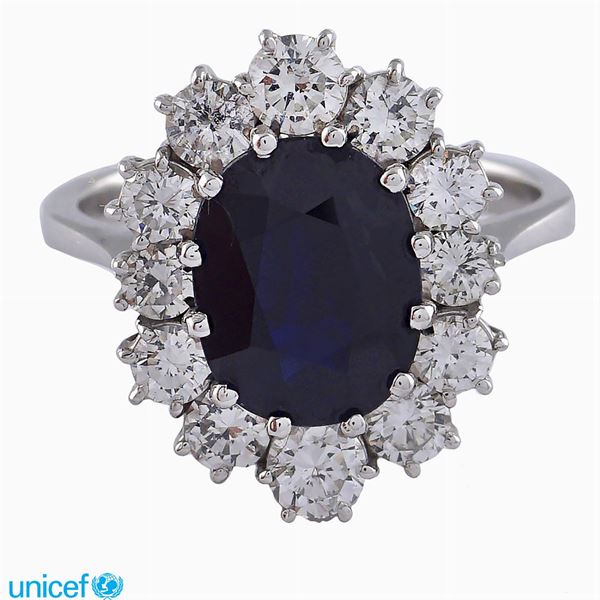 taglio ovale ct 2,50 circa contornato da diamanti taglio brillante ct 0,80 circa, misura 12, peso 5,4 gr.