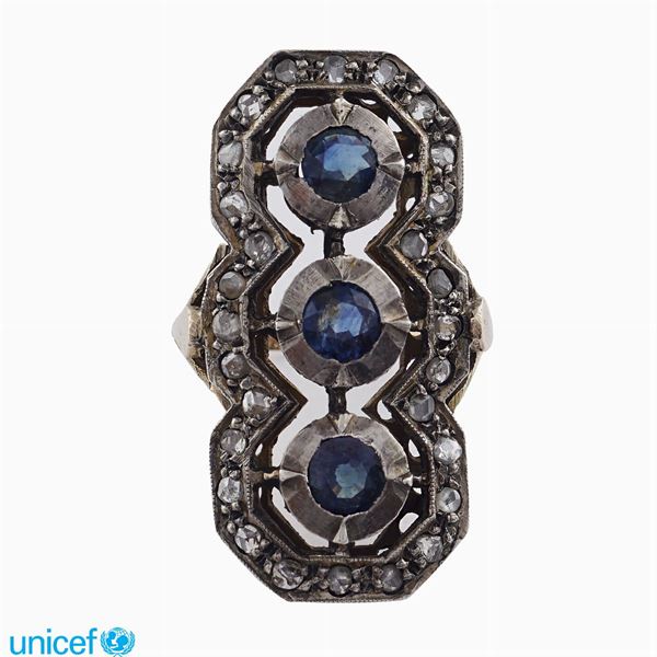 con tre zaffiri tondi al centro ct 1 circa contornato da rose di diamante, misura 14 , peso 8 gr.