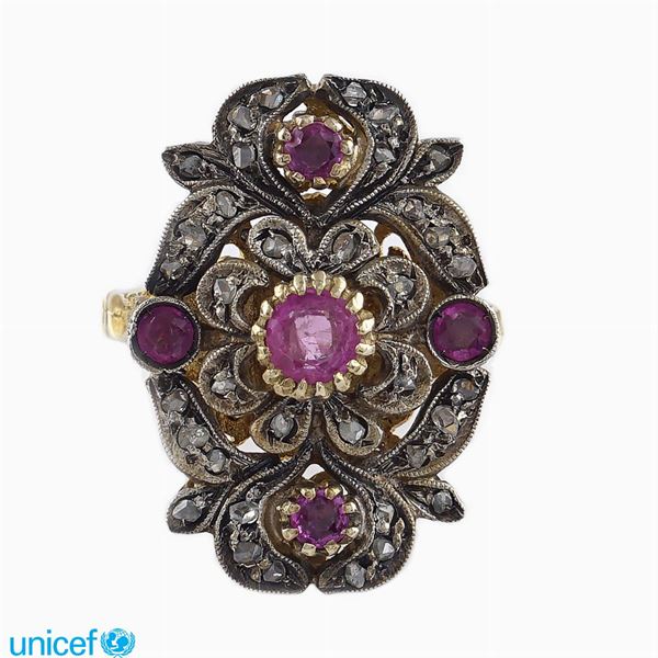 con rubini tondi ct 0,70 circa e rose di diamante, misura 16 , peso 10 gr.