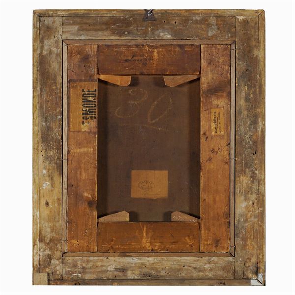 "Paesaggio con pastori", olio su tela, entro cornice in legno dorato. All'esame della lampada di Wood, il dipinto presenta pochi interventi di ridipintura. Sul retro è presente un' etichetta con scritta a stampa che presenta la collezione di provenienza "Grattan Collection"., 49,5x38 cm.