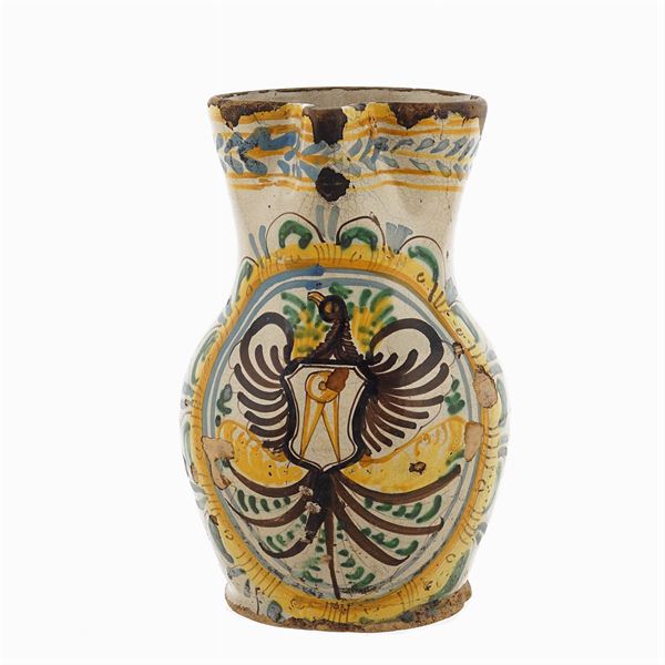 decorata in policromia con stemma entro riserva, manico sagomato, difetti e mancanze, h. 27,5 cm.