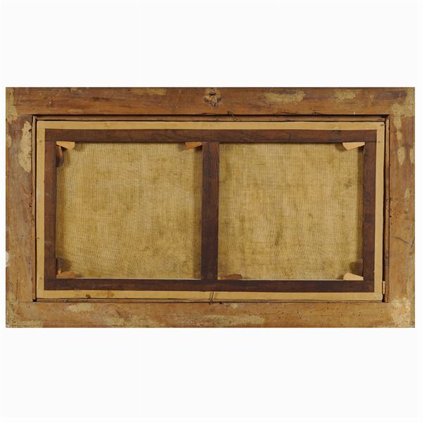 "Scena di battaglia con torre a destra", olio su tela, entro cornice, 49,5x99 cm.