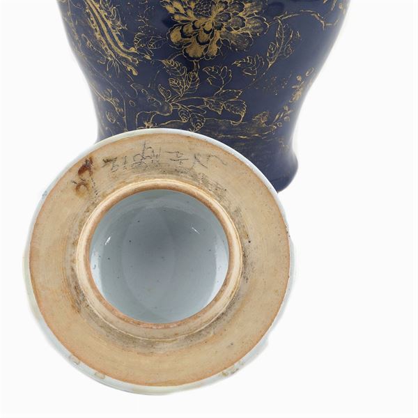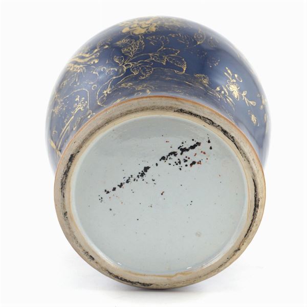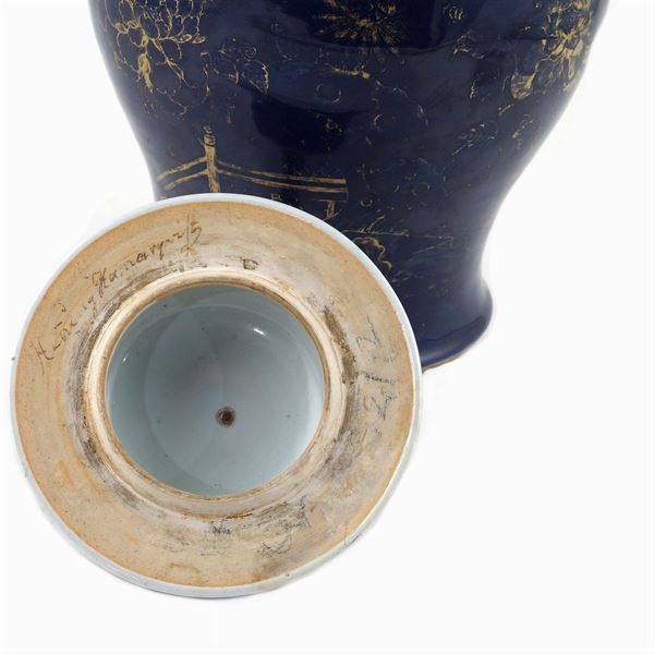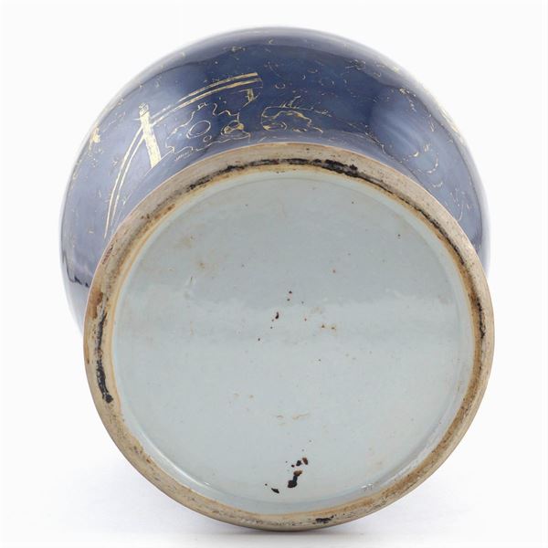 decorate in oro a motivi di paesaggi orientali, presa a foggia di cani di Pho, decorazione parzialmente usurata, h. 47 cm.