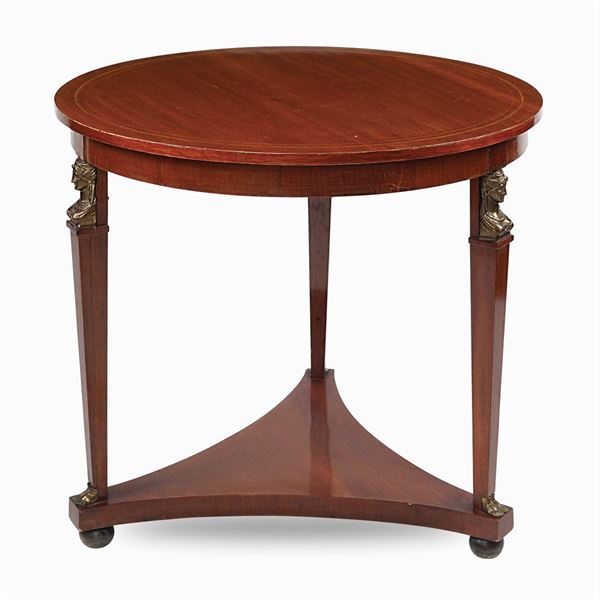 piani circolari filettati in bois de rose, bosso ed ebano, sostegni troncopiramidali adornati da cariatidi in bronzo riuniti da base con terminali a sfera, lievi mancanze, 74x84 cm.