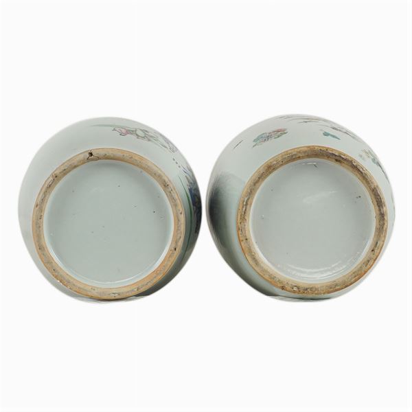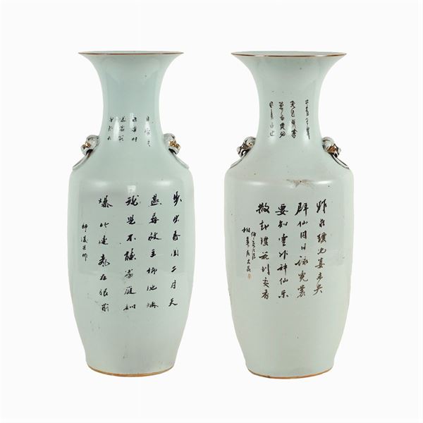 corpo a balaustro decorato in policromia con scene di vita orientale, ai lati cani di Pho in rilievo, recano iscrizioni sul retro, lievi difetti, h. 57 cm.