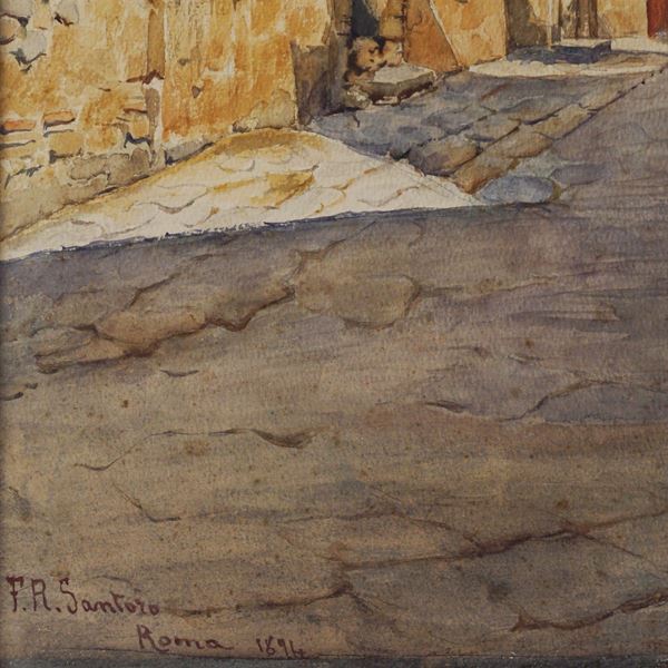 "Scorcio di vicolo", 1894, acquarello su carta intelata, firmato e datato in basso a sinistra, entro cornice, 55,5x36 cm.