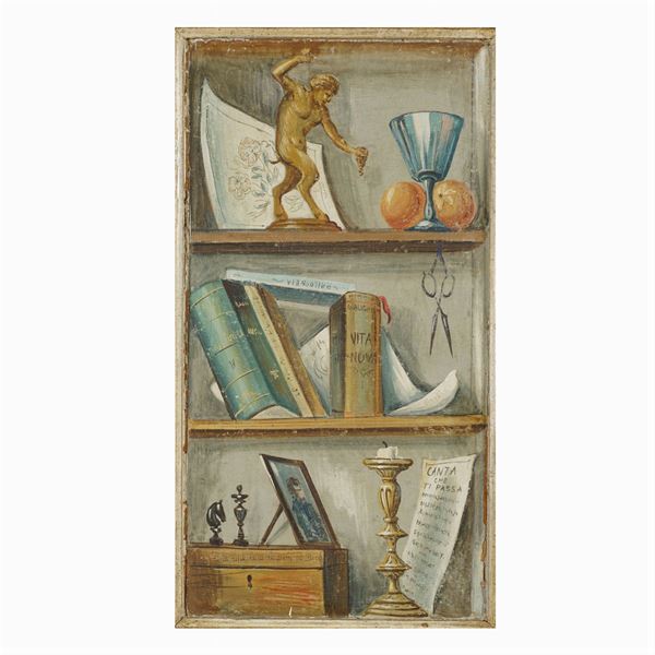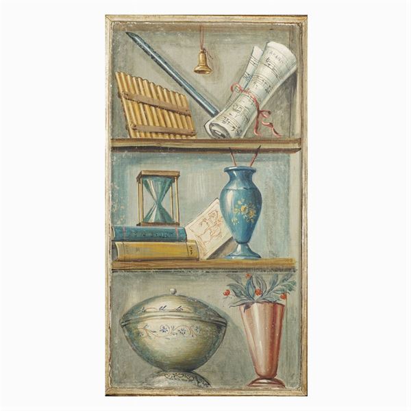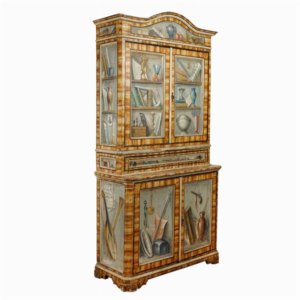 interamente laccata a raffigurare vasellame e strumenti vari, parte superiore con fronte a due sportelli ed un cassetto, parte inferiore con fronte a due sportelli, lievi usure, 213x105x44 cm.