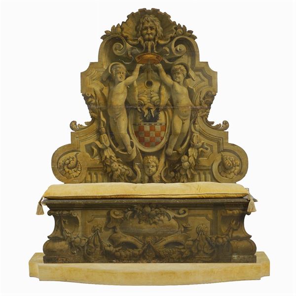 decorata con motivi di putti, ghirlande e volute vegetali, seduta apribile, completa di cuscino con all'interno un vano contenitore, poggiante su base di linea sagomata rivestita in velluto, lievi difetti