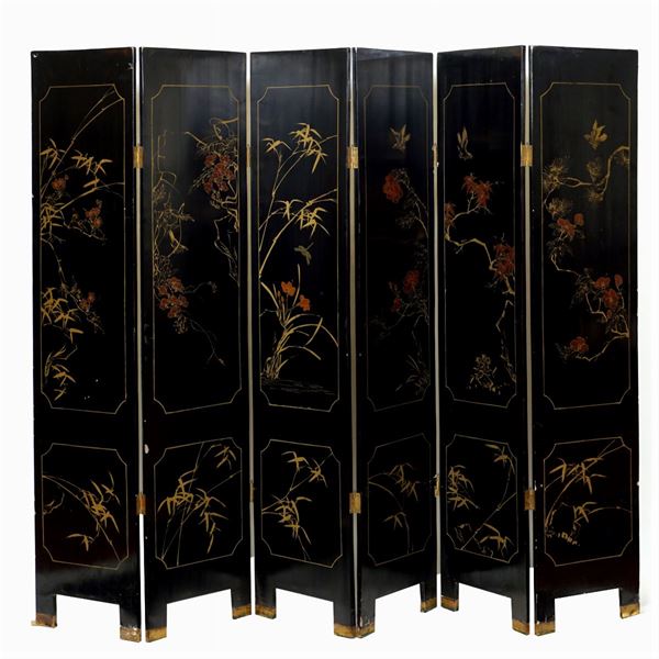 decorato con madreperla e oro a raffigurare scene di vita orientale e motivi naturalistici, lievi difetti, 185x240 cm.