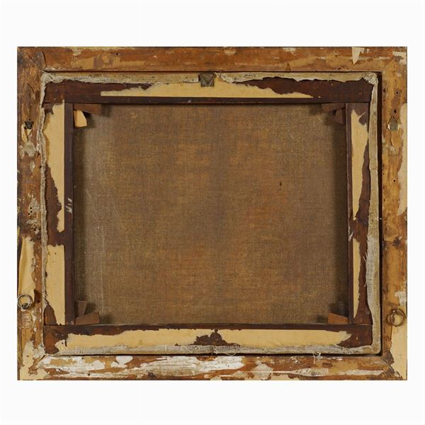 "Scena d'interno con personaggi", olio su tela, entro cornice in legno dorato, 51,5x62 cm.