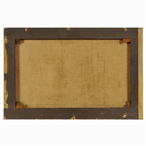 "Natura morta con zucca e tankard", olio su tela, entro cornice in legno dorato. All'esame della lampada di Wood, il quadro non presenta interventi di restauro. Il dipinto è stato reintelato in epoca recente ed è in ottimo stato di conservazione., 38,5x57 cm.