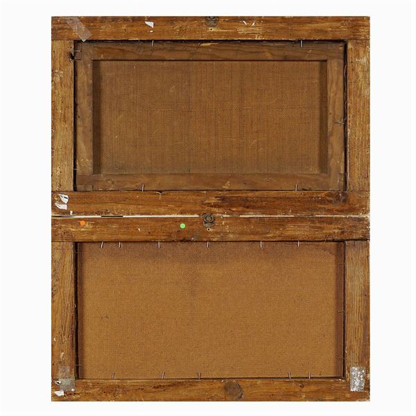 "Paesaggi marini con personaggi", coppia di oli rispettivamente su tela e su masonite, firmati in basso a destra, entro cornici in legno dorato, 24x45 cm.