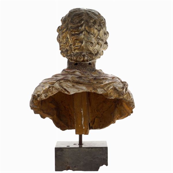 "Busto reliquiario di Santo", cartapesta argentata su base di marmo non coeva., h. 52 cm.