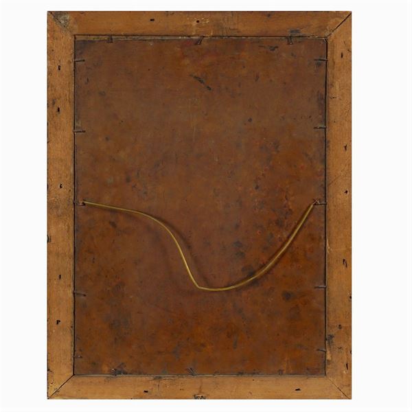 "Adorazione dei Magi", olio su rame, entro cornice in legno dorato.